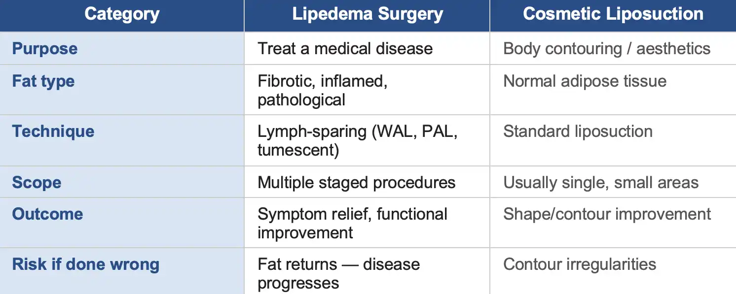 Lipedema liposuction is not cosmetic liposuction. The purpose, technique, and medical context are fundamentally different. And choosing the wrong type — or a surgeon unfamiliar with Lipedema — can cause diseased fat to return, disease progression to accelerate, and the lymphatic system to suffer lasting damage.